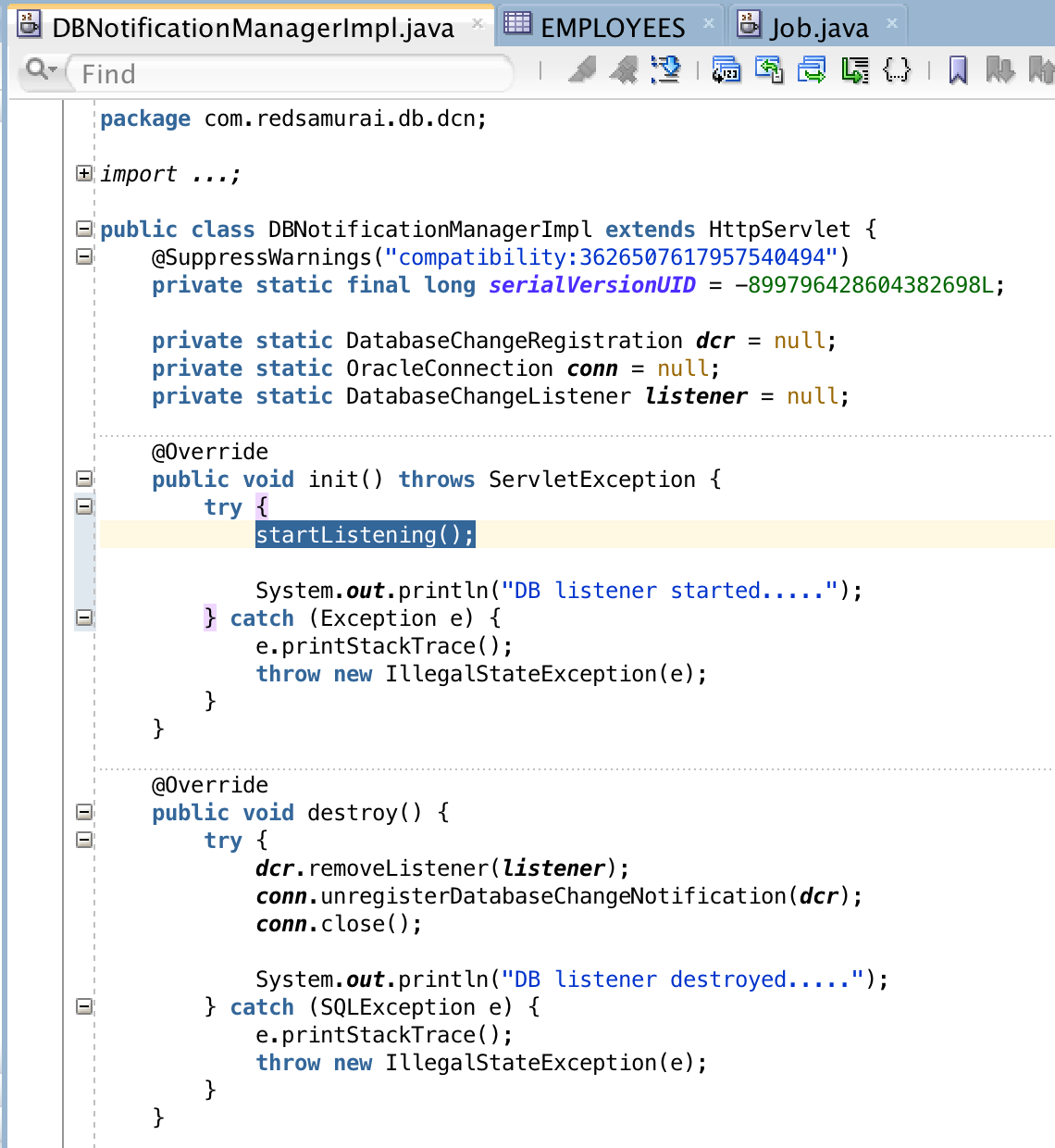 Change notification is iniatilized by DB and handled by JDBC listener. There are two important steps for such listener - start and stop. Sample application - WebSocketReusableApp.zip, implements servlet DBNotificationManagerImpl: